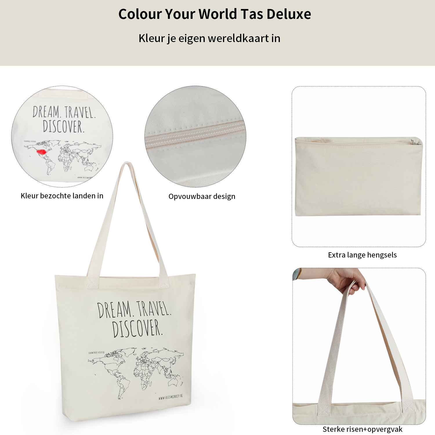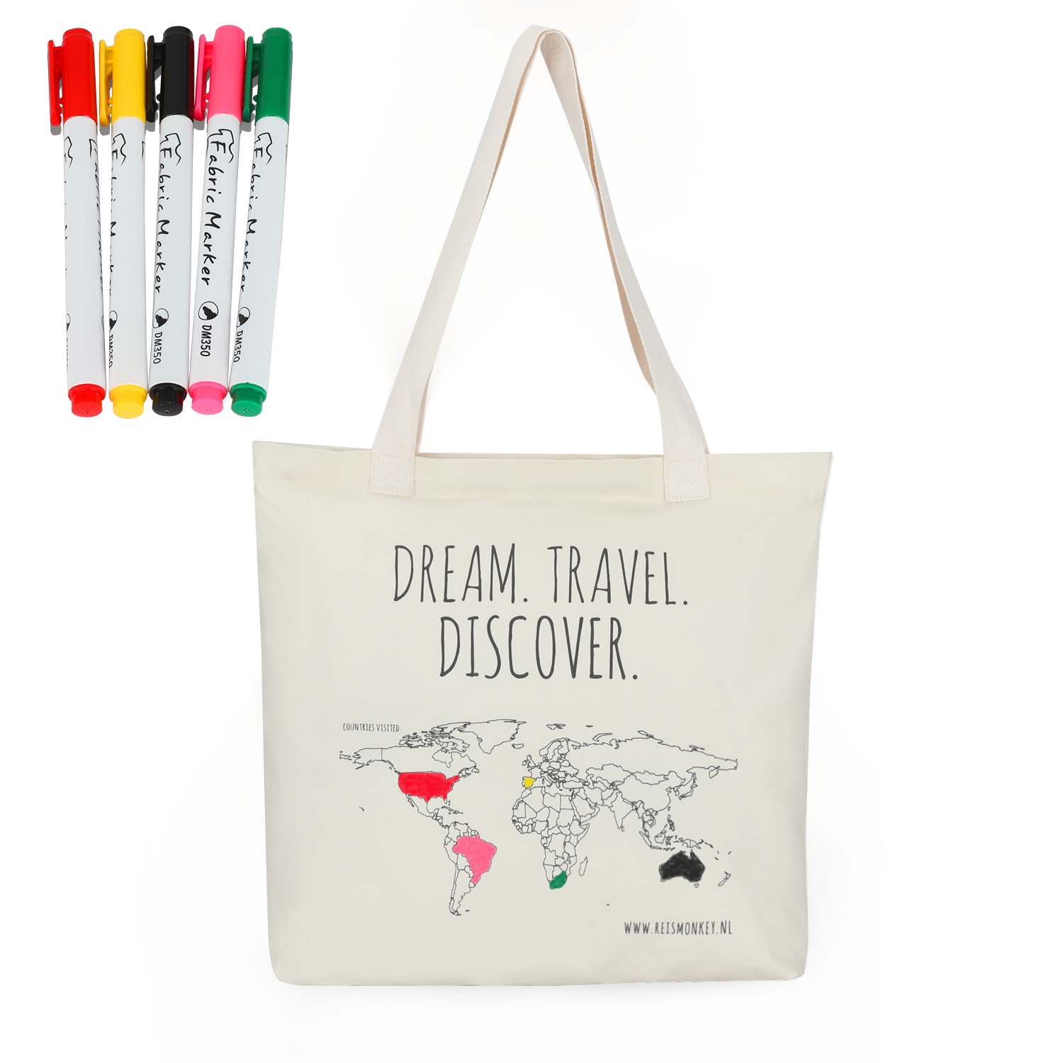 Deze katoenen tas wordt alleen bij Reismonkey aangeboden en is leuk voor een verjaardag of als afscheidscadeau voor een reiziger. De tekst 'Dream, Travel, Discover' is toepasselijk. Het leuke is dat jouw reizende vriend of vriendin met een stift alle landen in kan kleuren die hij of zij bezocht heeft.