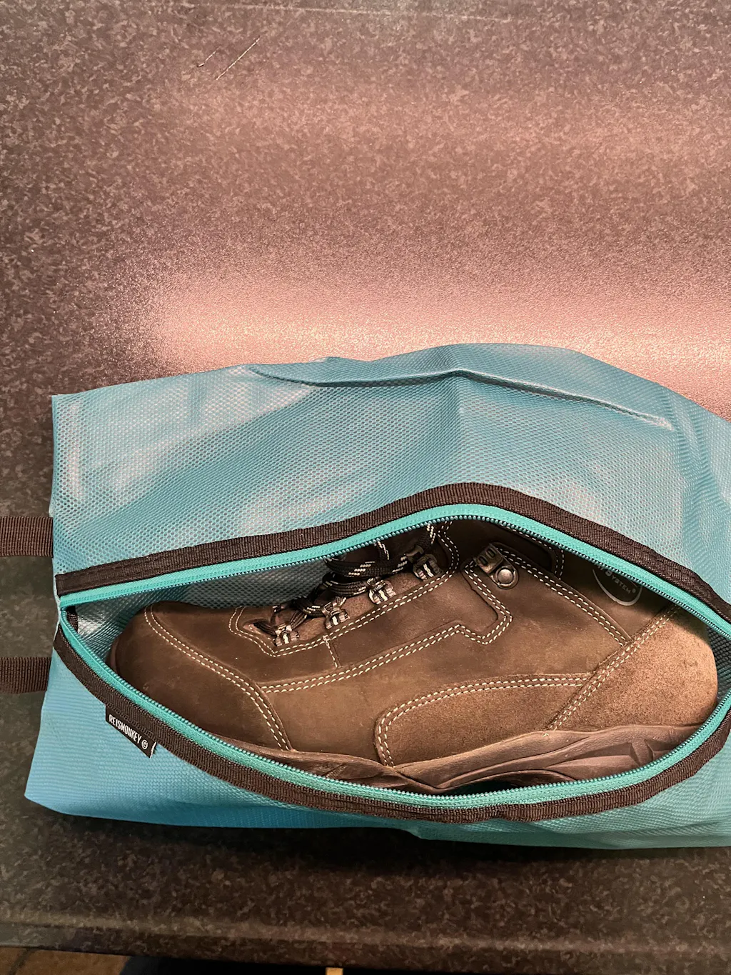 Aan de andere kant werkt het materiaal ook andersom. Als je na een hike vuile of natte schoenen hebt kun je jouw (wandel)schoenen in de schoenentas doen om zo de rest van je bagage te beschermen. Het handige is dat dit niet alleen voor schoenen zo werkt, maar ook voor een natte handdoek die nog niet droog is of kleding. Zo blijft de rest van jouw bagage geurvrij.